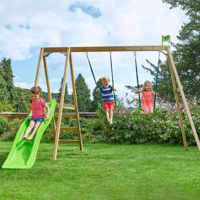 Made from FSC® certified timber, this fun activity frame has two single swing seats, so double the fun! Comes complete with wavy slide for speedy exits.