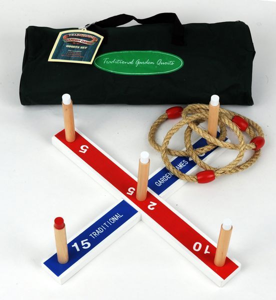 These garden quoits come in a canvas bag with 4 rope rings, a sturdy quoit base (42cm x 42cm), and screw in scoring stakes. This game is great for garden parties.